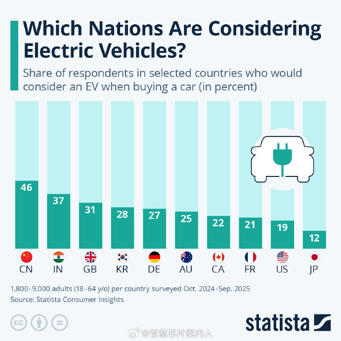 【CNMO科技消息】10月26日正规配资炒股网站,Statista统计了过去12个月不同国家对电动汽车的购买的考虑比例。中国消费者对电动汽车的购买意愿高达46%。