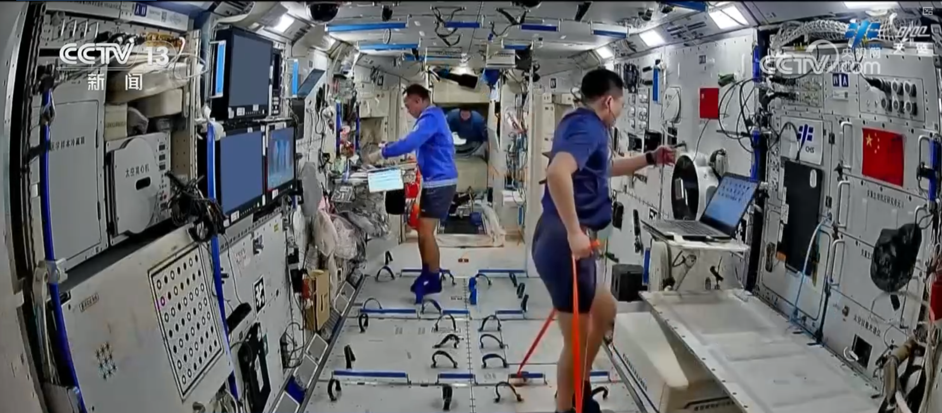 三名航天员使用笔记本电脑及相关实验软件,完成了航天人机信任、探索利用研究、元认知监控研究、在轨情绪状态测试、应急决策能力评估等多个项目的测试工作。此外,下肢力刺激测试按计划开展,航天员穿着仿生黏附鞋,使用相应装置进行锻炼,实现失重环境下锻炼过程中下肢屈肌的力刺激。同时,采集下肢肌群肌电数据与肌肉超声数据,用于进一步开展研究。